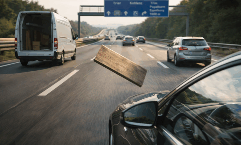 Holzlatte fliegt auf A1 von Transporter und crasht in Windschutzscheibe