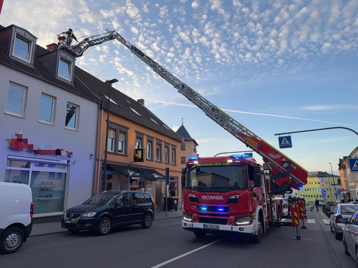 Neunkirchen – Ein ungewöhnlicher Einsatz hat die Freiwillige Feuerwehr Neunkirchen-Innenstadt am Samstagabend (18. April 2026) über mehrere Stunden gefordert. Gegen 19:40 Uhr wurden die Einsatzkräfte zum Oberen Markt alarmiert, nachdem sich eine Katze bereits seit Tagen auf dem Dach eines Wohn- und Geschäftshauses aufhielt und nicht mehr eigenständig herunterkam.